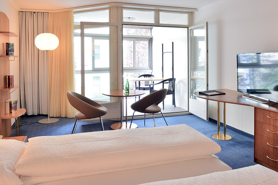 Die ideale Lage des Zimmers sowie ein grosser Kleiderschrank bieten zusätzlichen Komfort. Lebendige Kunstwerke und ein tiefblauer Teppich setzen farbliche Akzente. Der Mix aus modernen und klassischen Elementen schafft einen einladenden, funktionalen Raum, der sowohl Geschäfts- als auch Urlaubsreisenden einen komfortablen Aufenthalt garantiert.